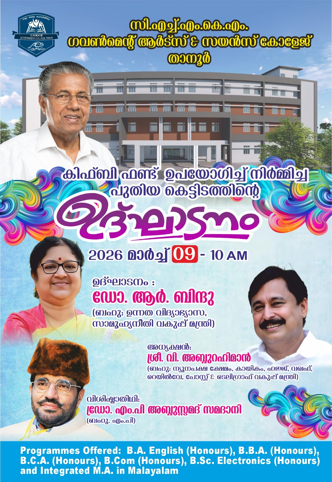 About UsC.H.M.K.M Govt. Arts & Science College Tanur was established in 2013 as a part of establishing new Arts & Science Colleges in Assembly constituencies where there is no Govt. or Aided college. The College is affiliated to the University of Calicut. Now the college is temporarily located at Puthentheru, about 2 km away from Tanur town. It offers UG courses such as B.A English, B.Com, BBA, BCA, and B.Sc Electronics and Integrateg MA Malayalam. The college has been an entrance to the world of higher education for the public, especially for the people from coastal area. The college was also the fulfilment of the long-cherished dream of the people in and around Tanur constituency. The relentless efforts of Sri. Abdul Rahman Randathani, the then Honorble MLA of Tanur, made the dream of thousands of people living in the costal outskirts of Malappuram district into reality. The College was inaugurated on 1st August 2013 by the then Chief Minister of Kerala Sri.Oommen Chandy.